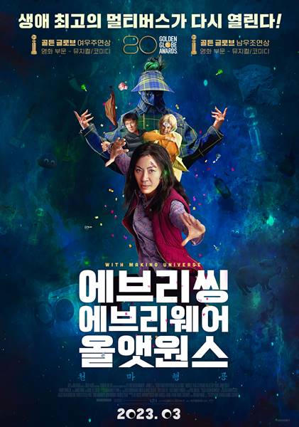 '에브리씽 에브리웨어 올 앳 원스’의 예술 세계는 Daniels 감독과 프로덕션 디자이너 Jason Kisvarday의 창의적인 비전이 빛나는 화려하고 다양한 장면입니다. 이 영화는 각각 고유한 스타일과 미학을 지닌 여러 우주를 가로지르는 여정으로 관객을 안내하며 미래지향적인 홍콩에서 복고 미래지향적인 LA까지, 사이키델릭 한 숲에서 포스트 아포칼립스 황무지에 이르기까지 영화는 감각에 도전하고 즐거움을 주는 시각적 향연을 만들어냅니다. 이 영화는 또한 실용성과 디지털 기술을 혼합하여 매끄럽고 몰입감 있는 경험을 제공하는 놀라운 시각 효과를 제공합니다. 영화는 캐릭터가 현실 사이를 이동할 수 있게 해주는 Quantum Key라는 장치를 사용하여 서로 다른 세계와 스타일 사이를 전환하는 내러티브 및 시각적 장치를 사용합니다. 이 영화는 또한 혁신적인 카메라 작업과 편집으로 움직임과 모험의 감각을 향상합니다. 에브리씽 에브리웨어 올 앳 원스는 예술 형식으로서의 영화의 힘과 아름다움을 보여줍니다. 다중 우주의 다양성과 가능성을 기념하고 관객이 자신의 정체성과 잠재력을 탐구하도록 초대하는 영화입니다. 에브리씽 에브리웨어 올 앳 원스는 매우 재미있습니다. Michelle Yeoh, Stephanie Hsu, Ke Huy Quan, Jamie Lee Curtis, Jenny Slate, Harry Shum Jr., James Hong 등의 배우들이 각자의 캐릭터에 몰입하고 살아있는 듯한 연기를 보여줍니다. 특히 Michelle Yeoh는 이 영화에서 두 가지 역할을 맡았는데 그 차이가 얼마나 큰지 보면 놀랄 것이다. 이 영화는 Son Lux가 작곡한 음악도 귀를 사로잡습니다. Mitski, David Byrne, André 3000, John Hampson, Randy Newman 등의 아티스트와의 협업으로 독창적이고 환상적인 사운드트랙을 만들어냈습니다. 이 영화는 2022년 SXSW에서 프리미어를 했으며 A24가 배급하였다. A24라고 하면 이미 퀄리티가 보장되는 것이다. 이 영화는 95회 아카데미 시상식에서 11개 부문에 후보 되었으며 7개 부문에서 수상하였습니다.